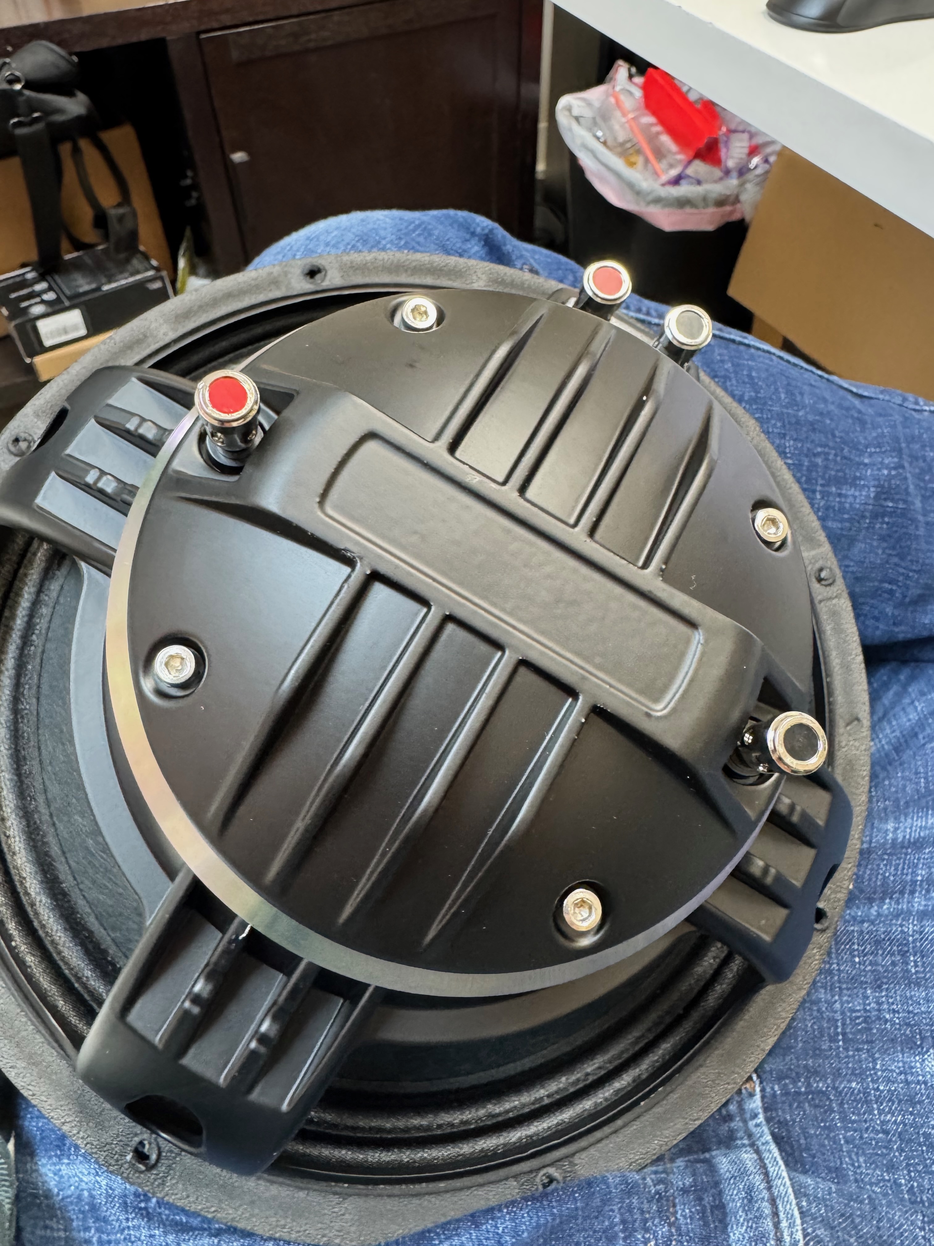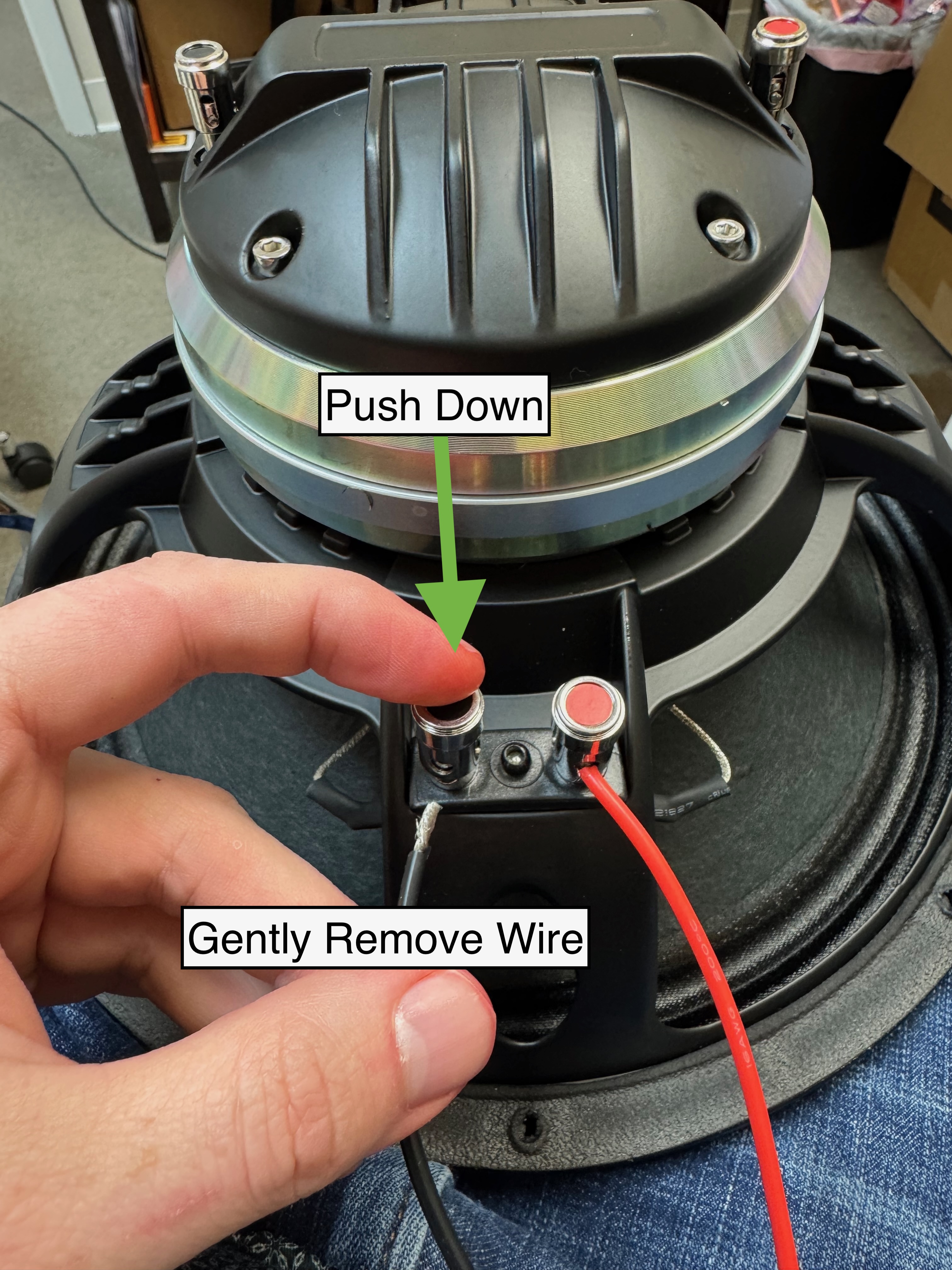 Reattach the wiring harness to the driver's terminals, pressing down on the push tab and reinserting the wire into the hole. Ensure the tab clamps down on the wire (and not the insulation) For woofers (lower frequencies), the red wire will connect to the red terminal and the black wire will connect to the black terminal. For tweeters (higher frequencies), the white wire is placed in the red terminal and the green wire is placed in the black terminal