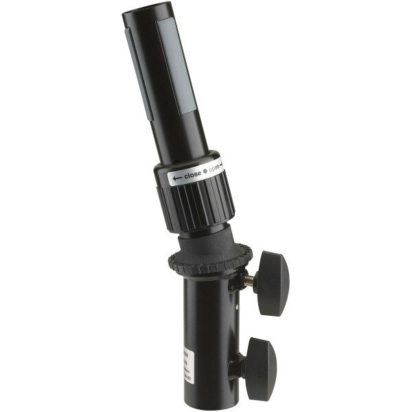 The K&M 21441 attaches to a 35mm pole (a sub pole or tripod) and adds the ring-lock mechanism to reduce any lean or wobble when a speaker is placed on the pole.